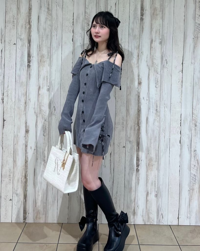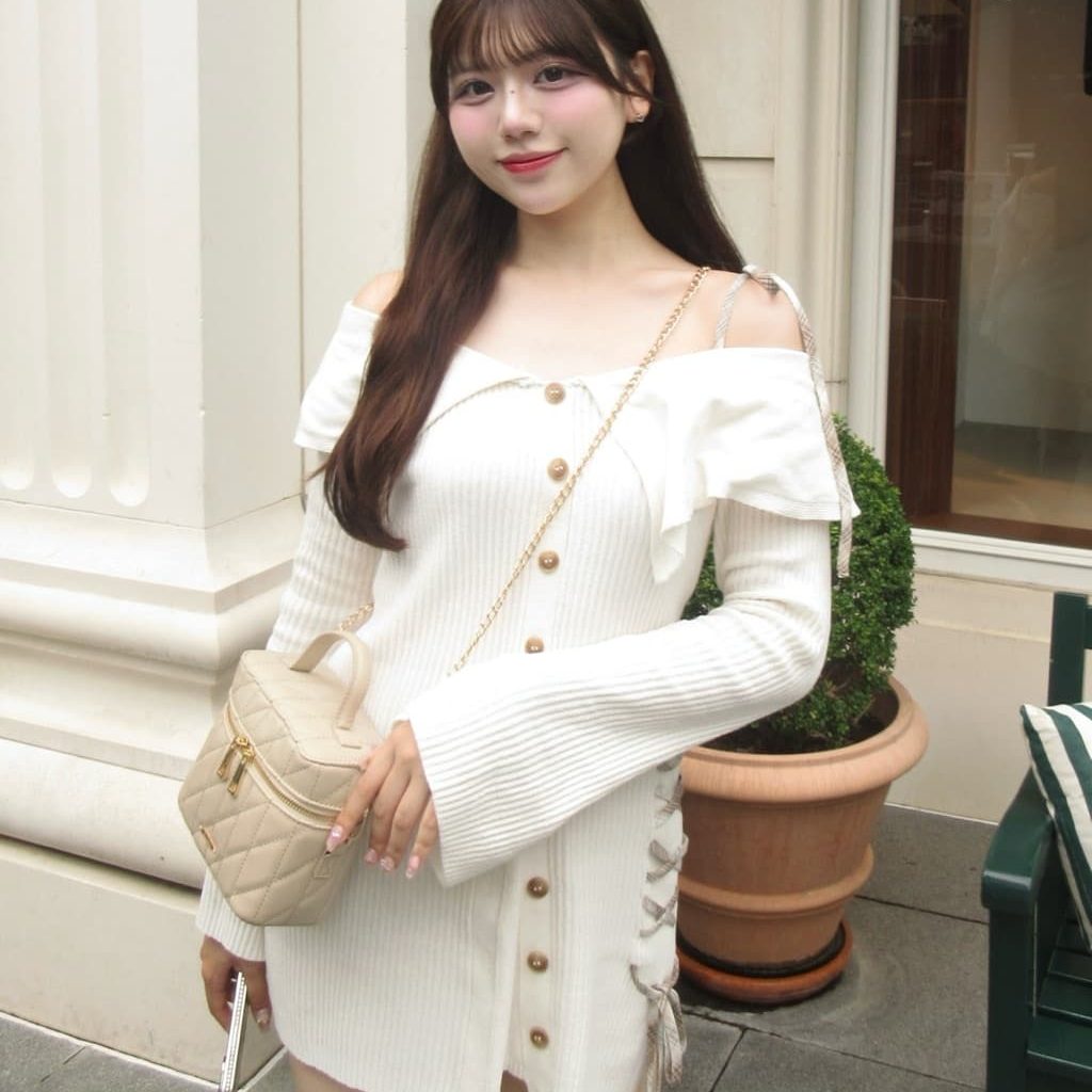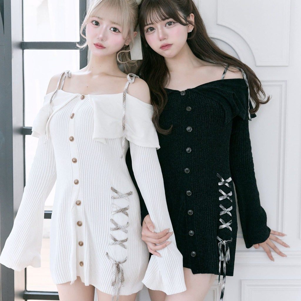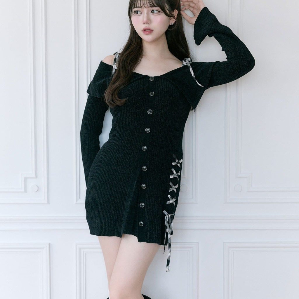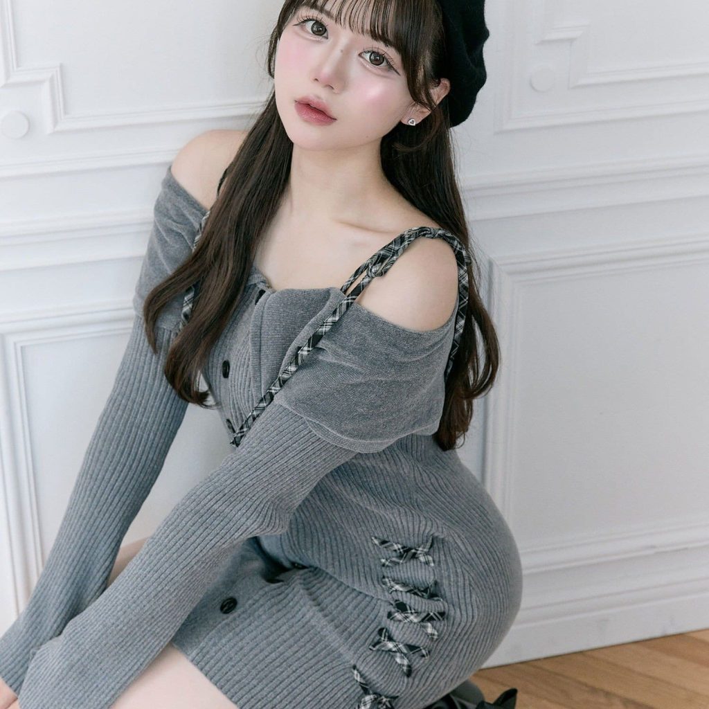 OLIVE des OLIVE側格紋交岔帶設計露肩毛衣洋裝